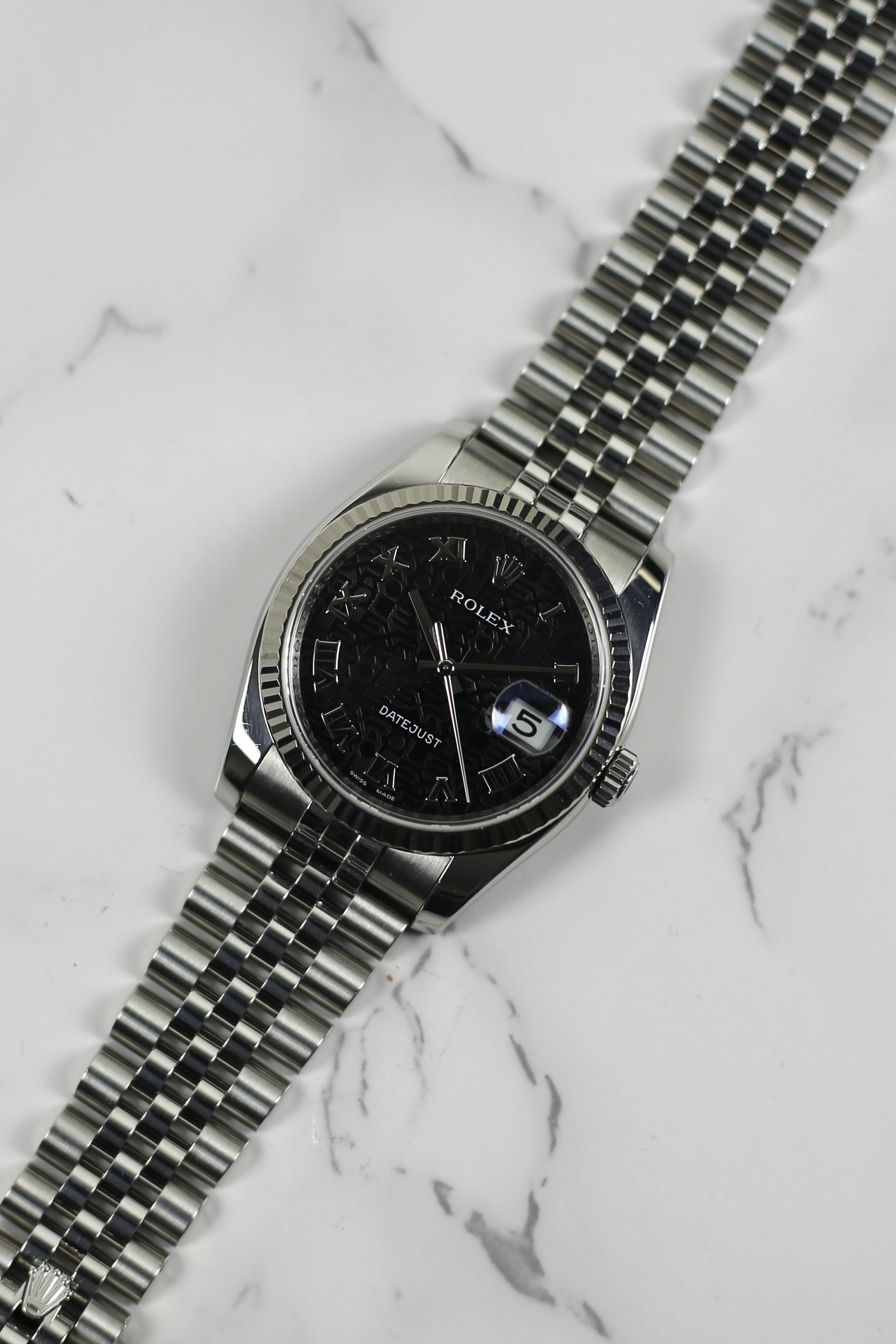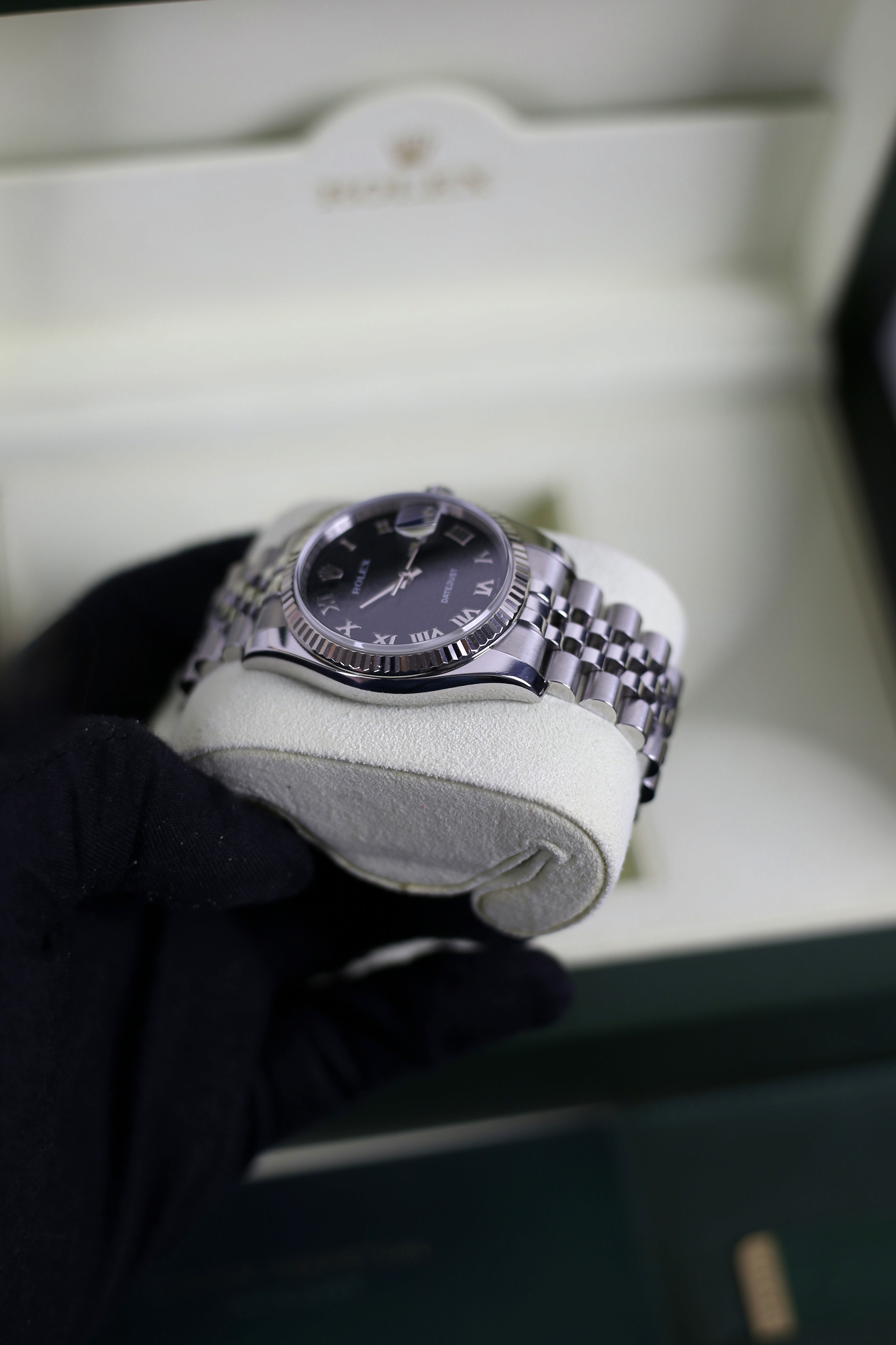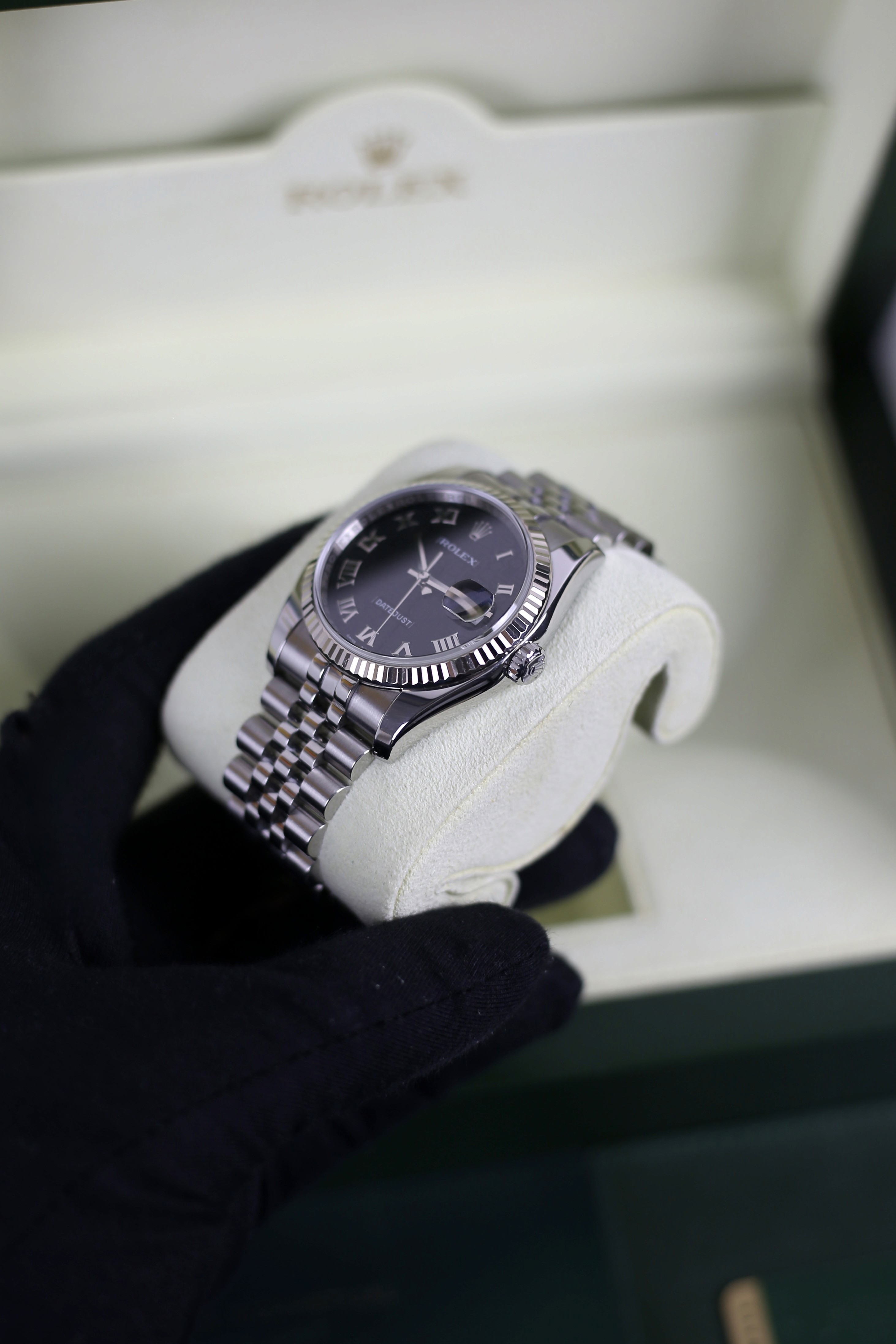 DATEJUST BLACK ROMAN COMPUTERIZED HIDDEN CLASP 18K WHITE GOLD BEZEL