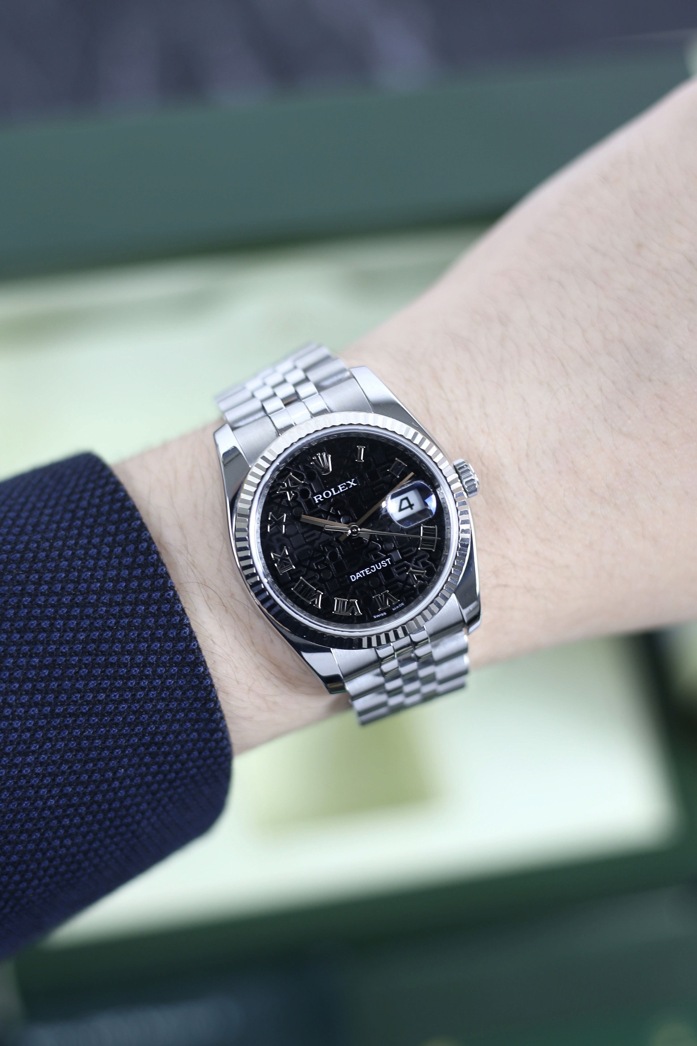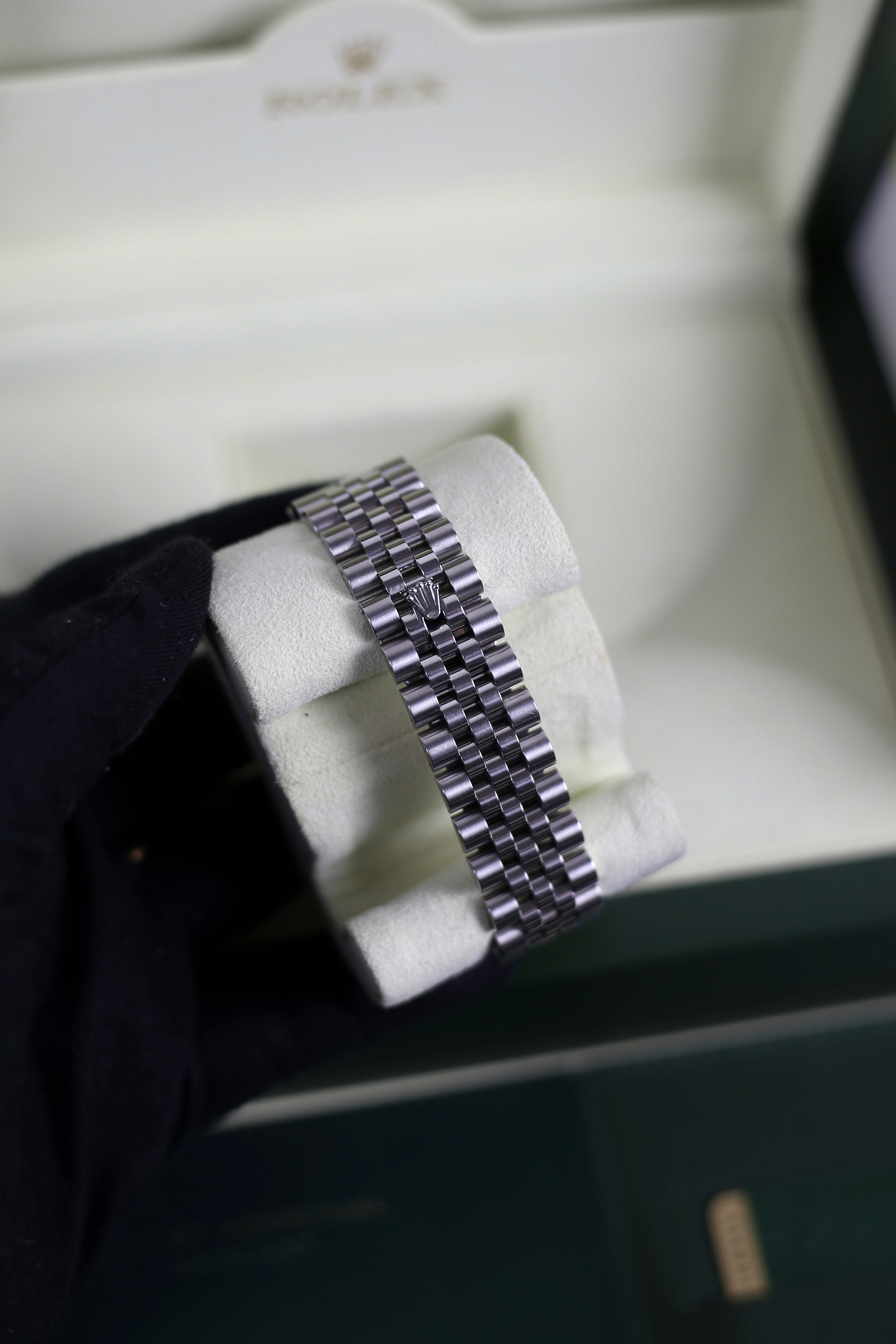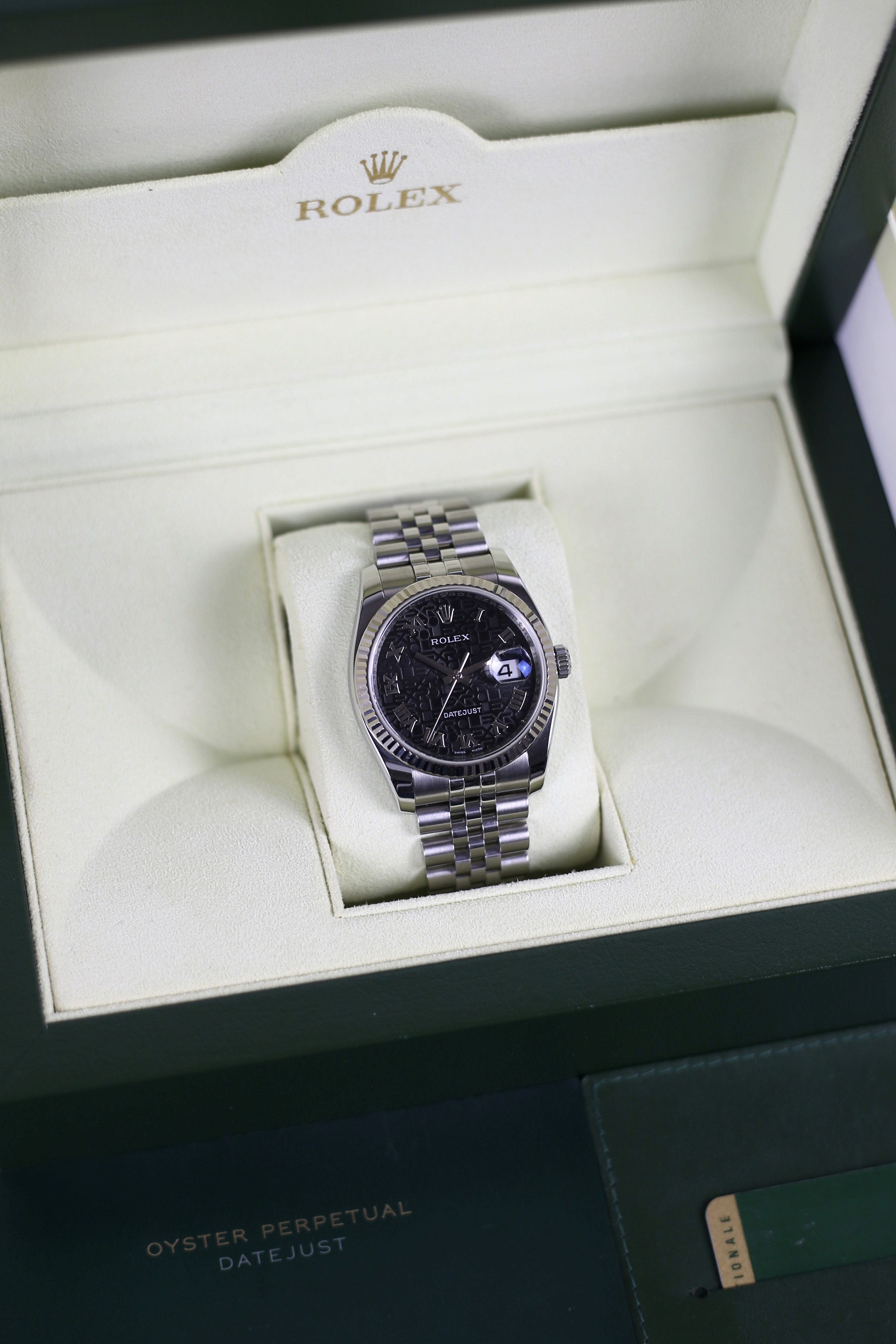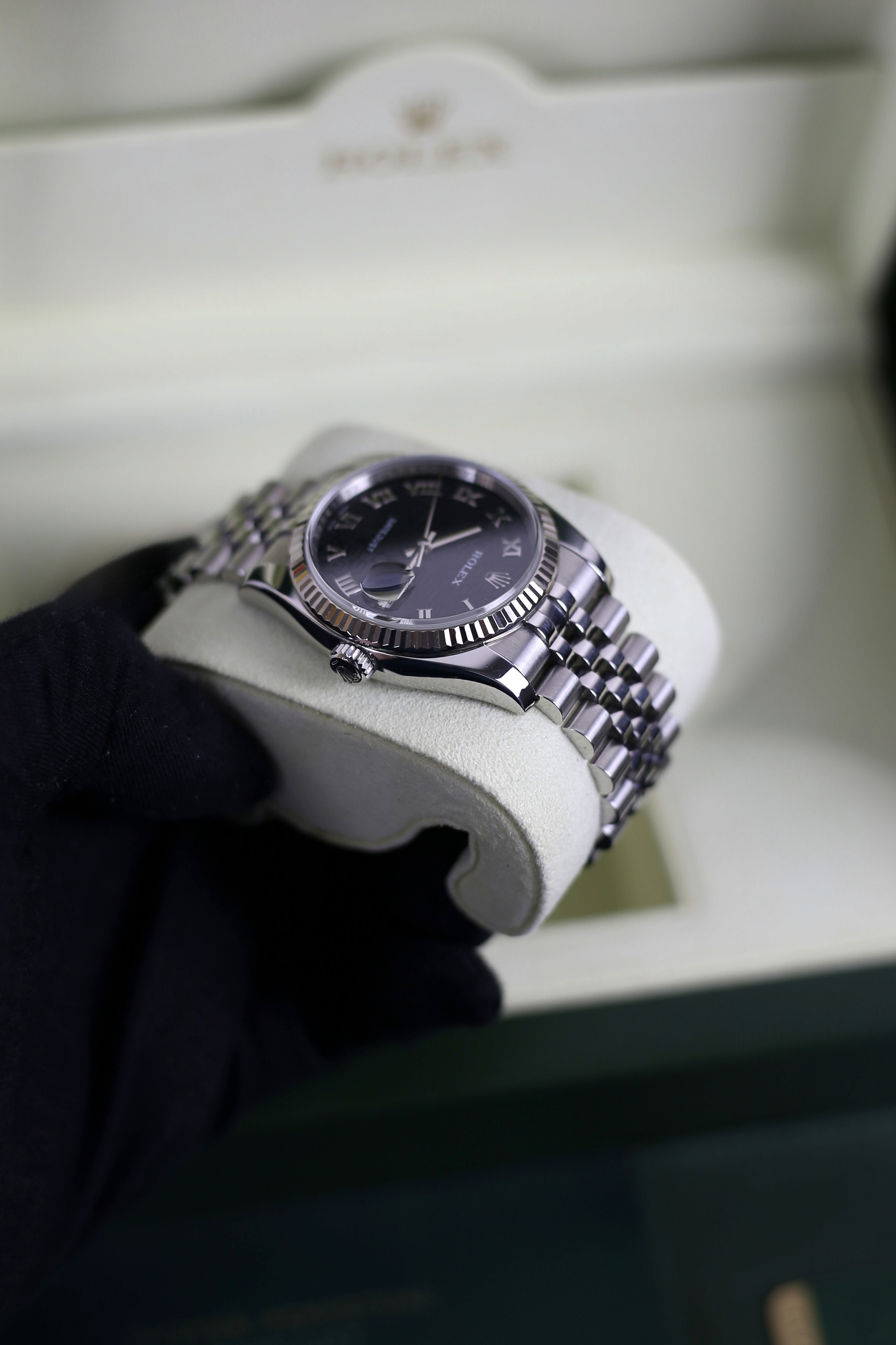 DATEJUST BLACK ROMAN COMPUTERIZED HIDDEN CLASP 18K WHITE GOLD BEZEL