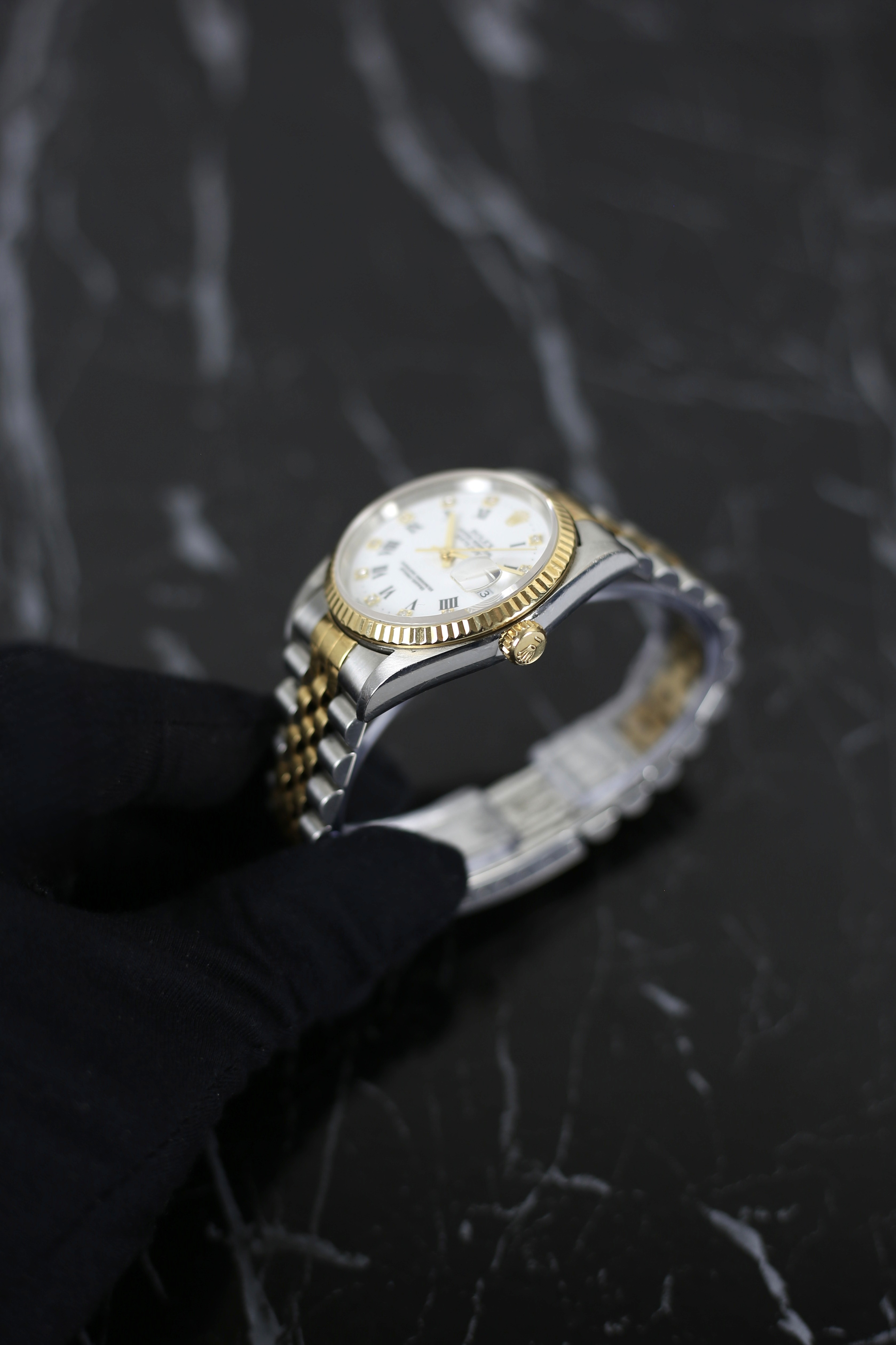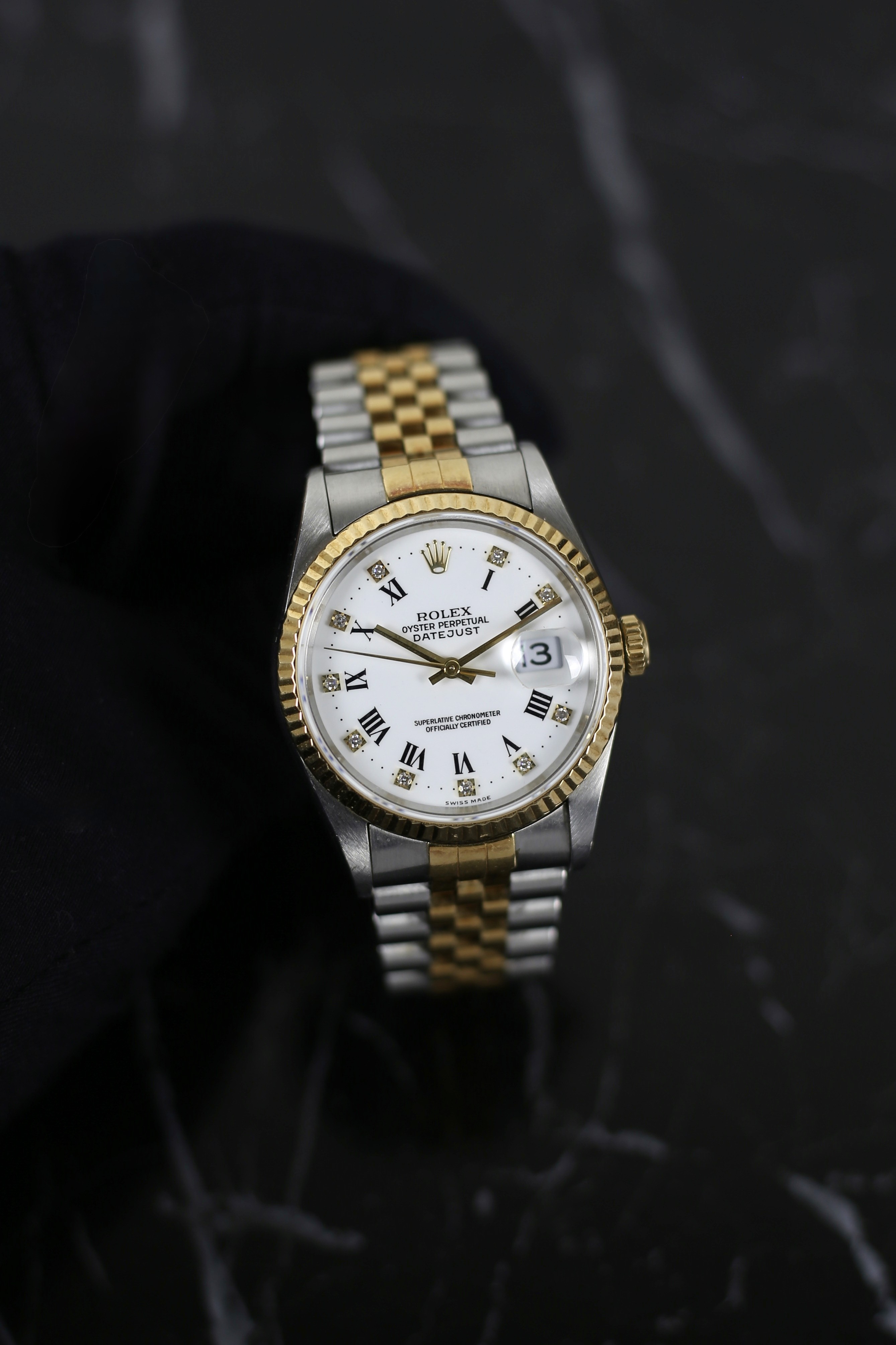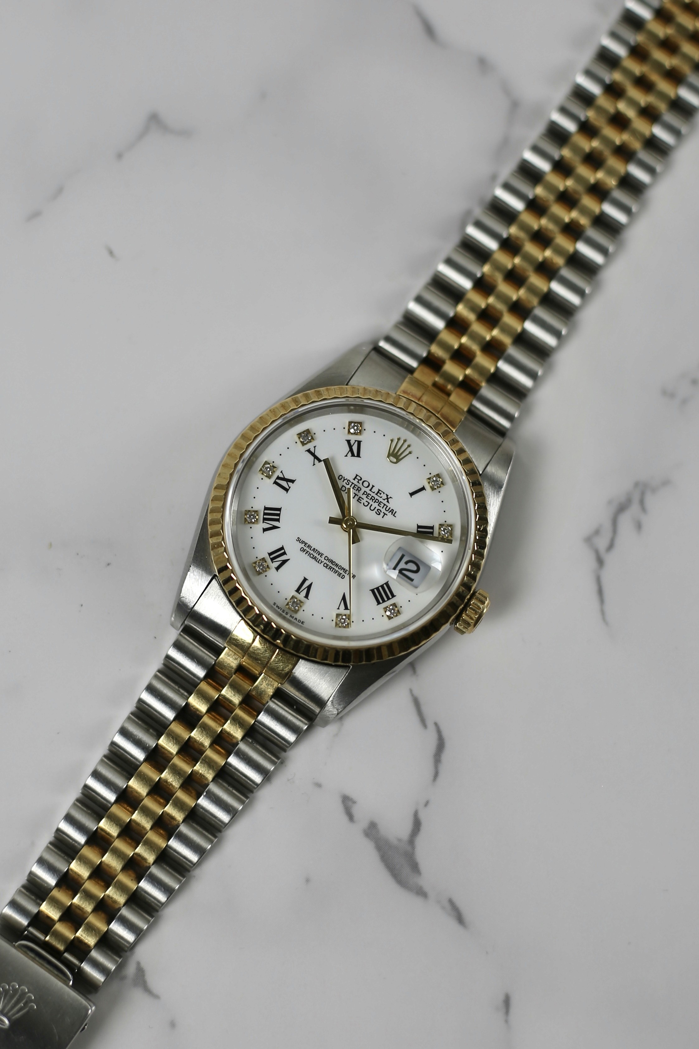 DATEJUST FACTORY WHITE ROMAN DIAMOND 18K YELLOW GOLD BEZEL
